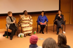 The Panel speaking at Shirley Chisholm Day at Brooklyn College, 2012, Linda Stein, Loretta Ross, Iris Lopez, Barbara Winslow.